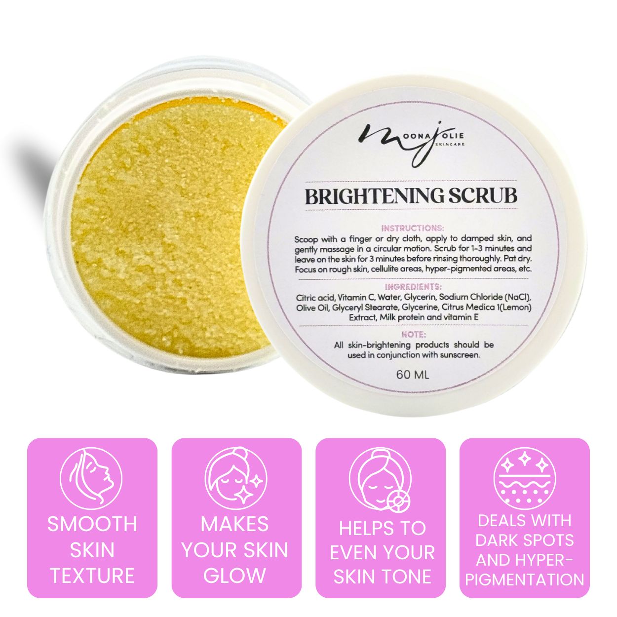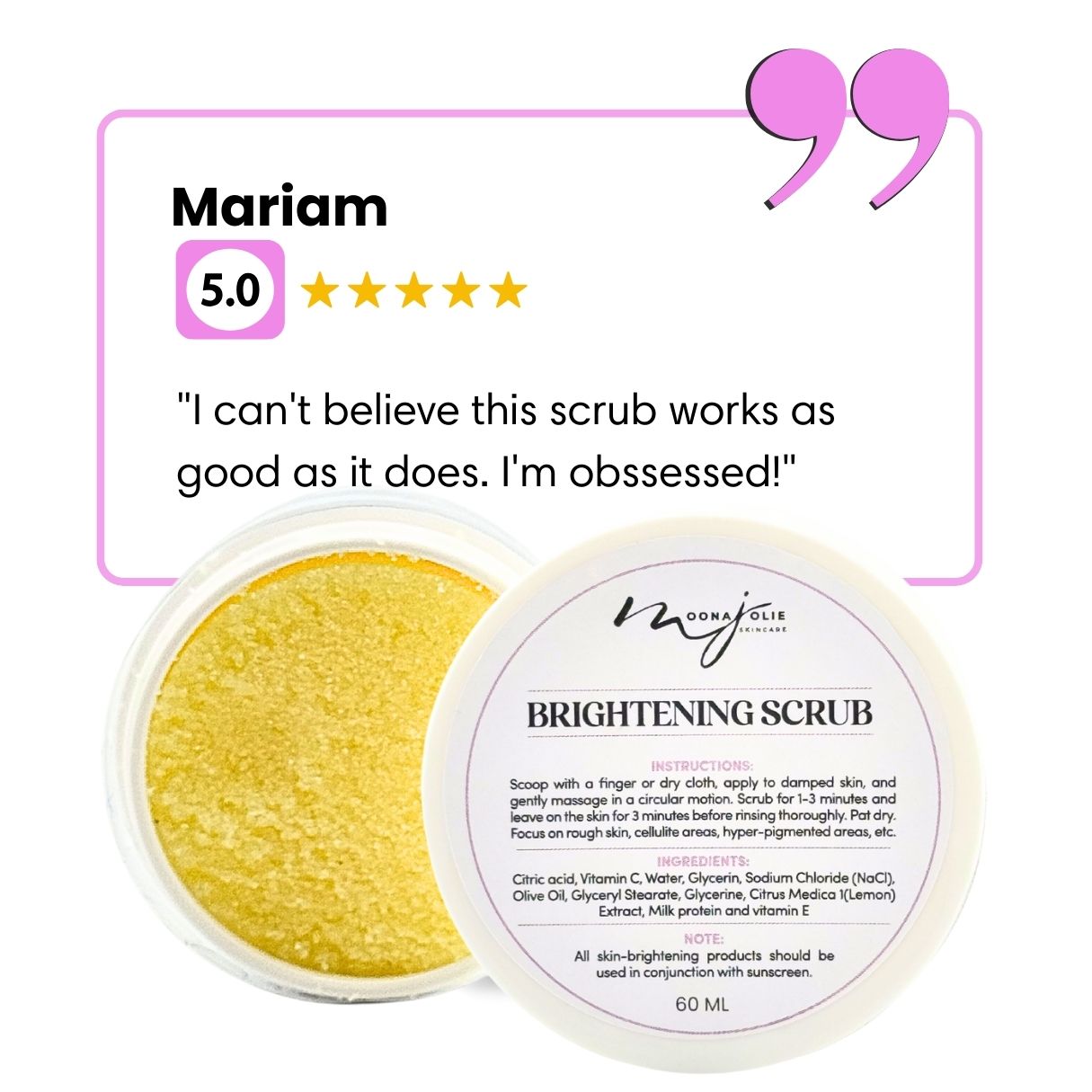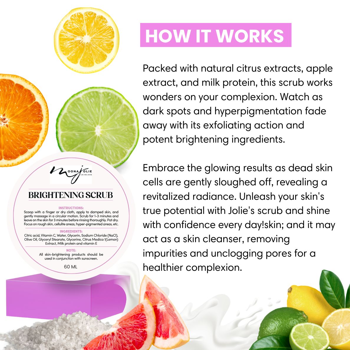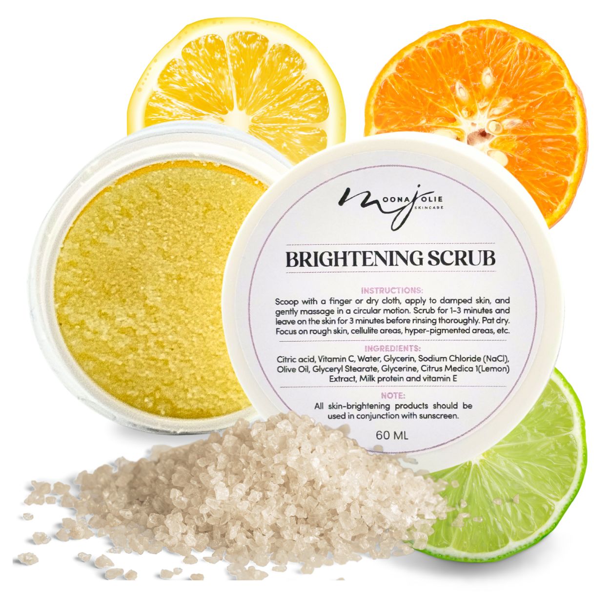 Moona Jolie Skincare's Exfoliating Brightening Scrub is a skincare product designed to help remove dead skin cells, unclog pores, and improve skin texture. This scrub typically contains exfoliating agents such as finely ground natural particles exfoliants. Additionally, it includes brightening ingredients like vitamin C, licorice extract, or niacinamide to enhance skin radiance and even out skin tone. Regular use of this scrub can leave the skin looking smoother, brighter, and more refreshed.