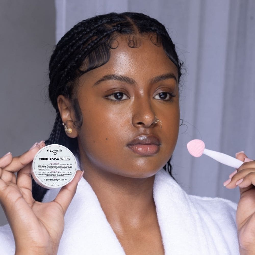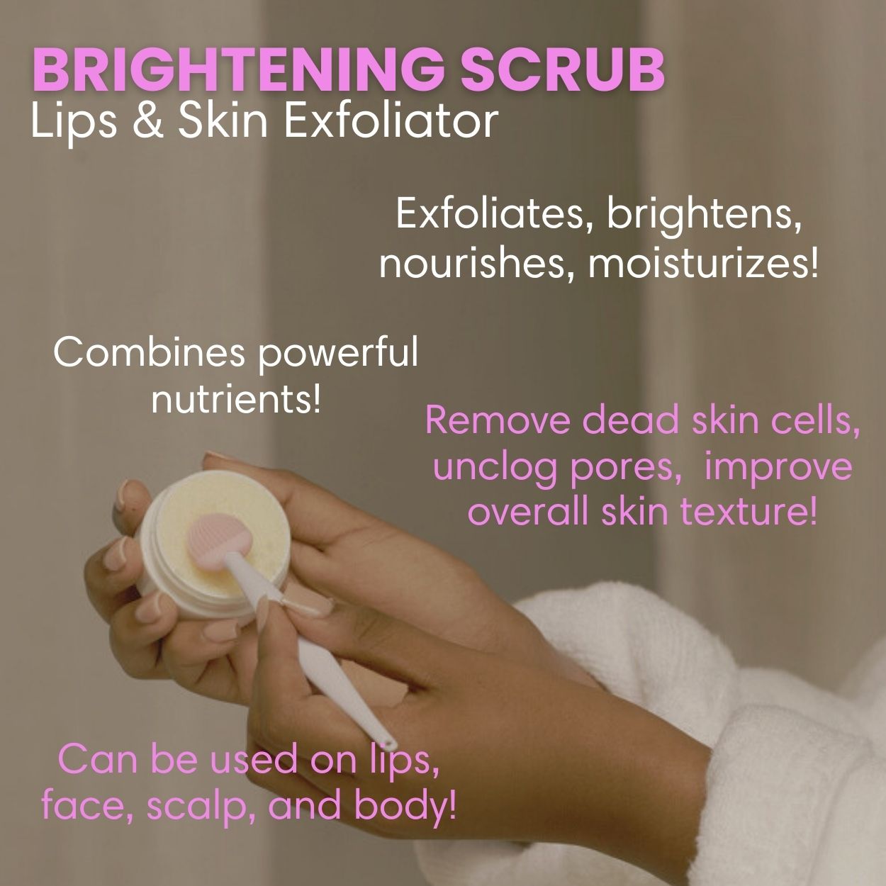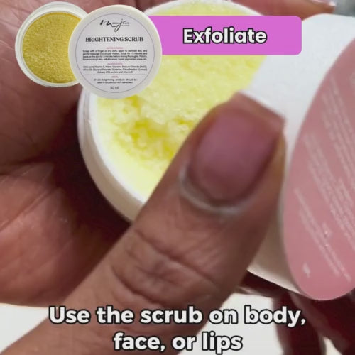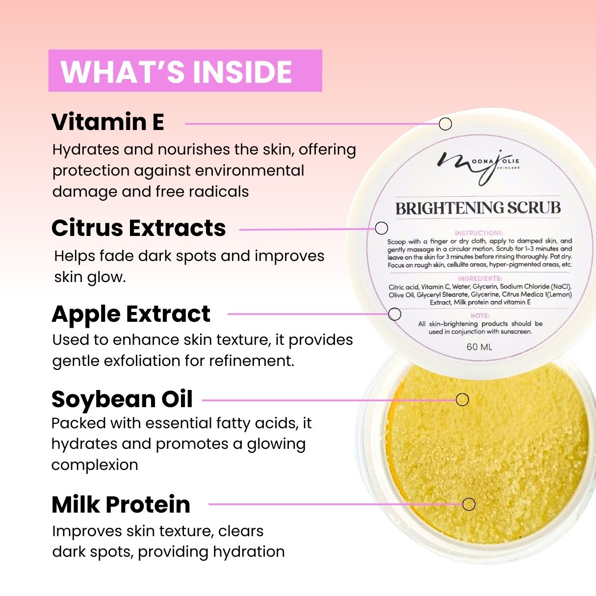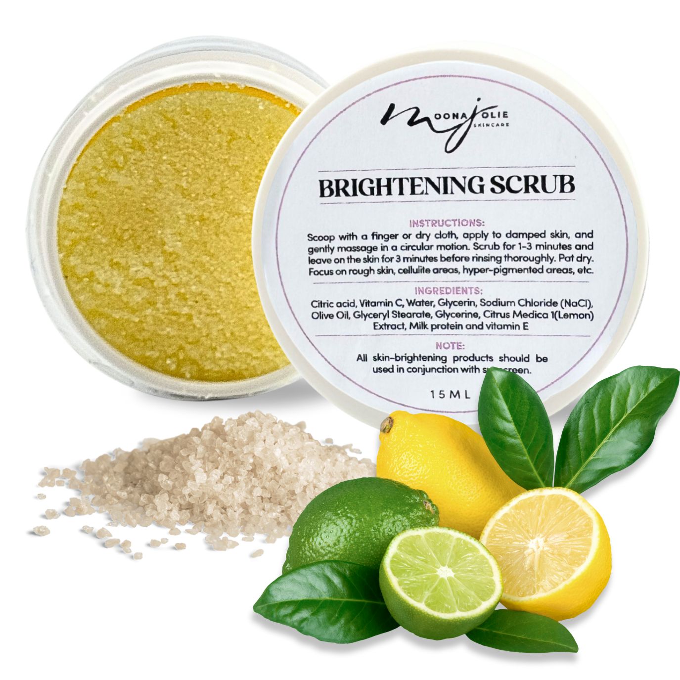 Moona Jolie Skincare's Exfoliating Brightening Scrub is a skincare product designed to help remove dead skin cells, unclog pores, and improve skin texture. This scrub typically contains exfoliating agents such as finely ground natural particles exfoliants. Additionally, it includes brightening ingredients like vitamin C, licorice extract, or niacinamide to enhance skin radiance and even out skin tone. Regular use of this scrub can leave the skin looking smoother, brighter, and more refreshed.