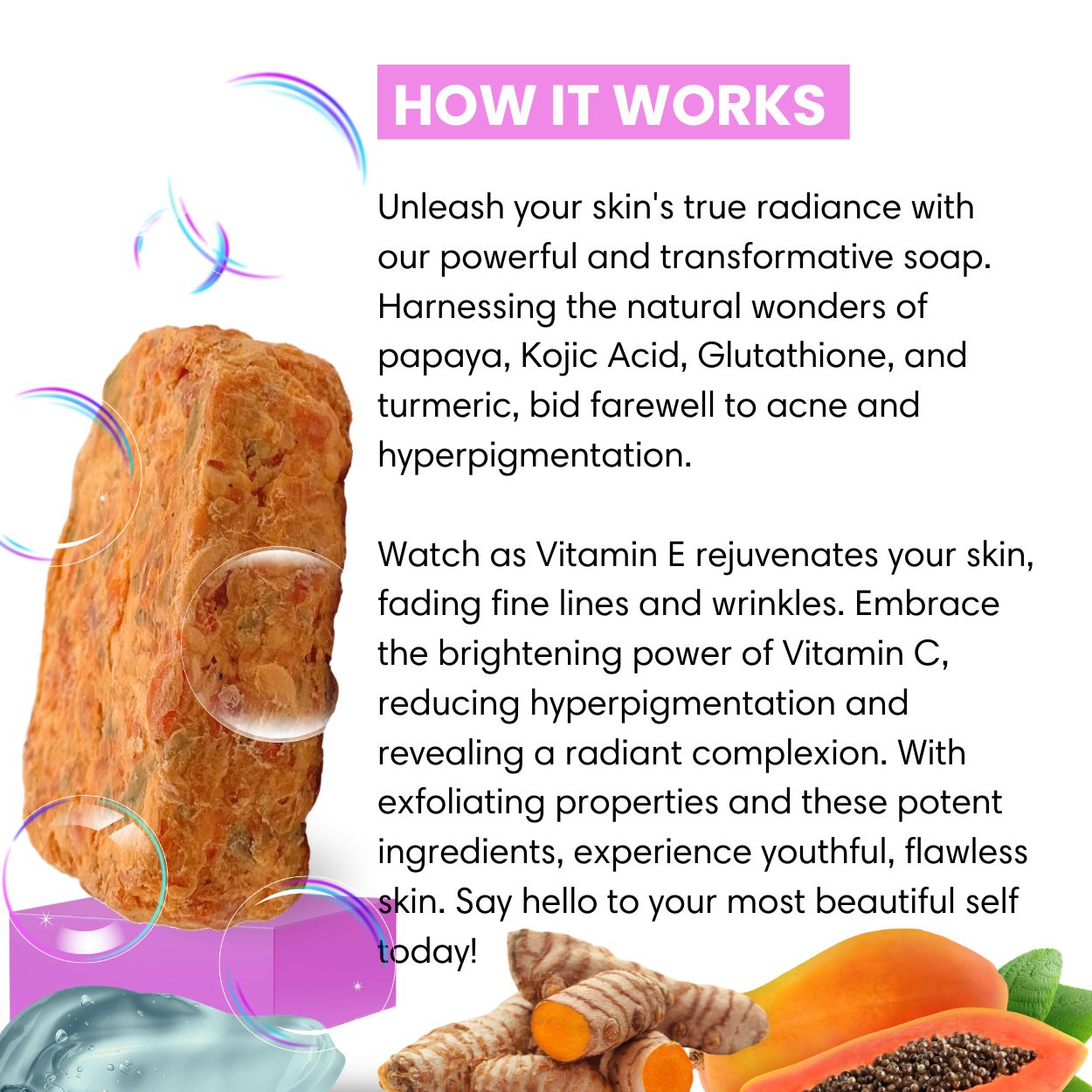 Designed to rejuvenate and illuminate your skin. Perfect for those who want to say goodbye to dullness, acne, and uneven skin tone. This luxurious soap combines the brightening benefits of Vitamin C with the restorative properties of Vitamin E.