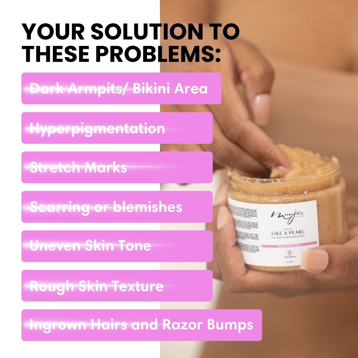 A) Moona Jolie Skincare is designed for individuals seeking natural and effective solutions to a variety of skin concerns, including skin brightening, uneven skin tones, discoloration, dark spots, acne, and other skin diseases.