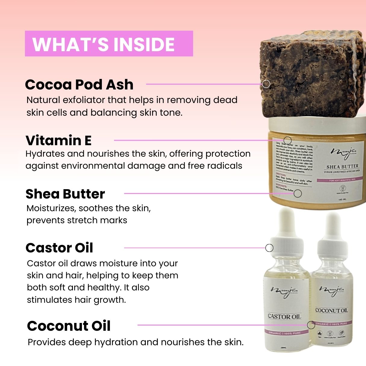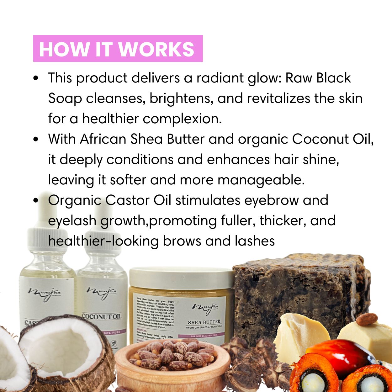 - Hyperpigmentation and Dark Spots: Ingredients like black soap and shea butter are known for their skin-brightening properties, which can help fade dark spots and even out skin tone.