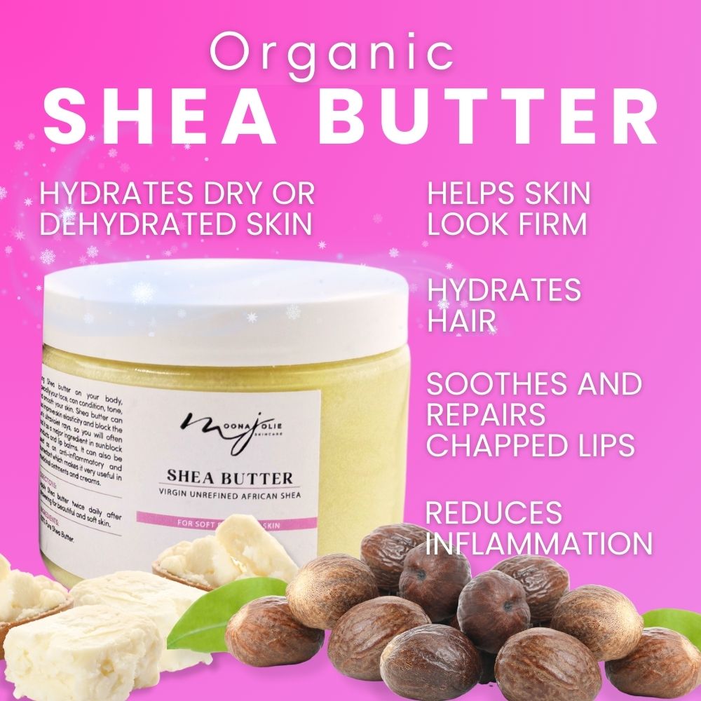Shea butter is a rich moisturizer that deeply hydrate and nourish the skin. It helps improve skin elasticity and smoothness, which can be beneficial for addressing stretch marks and scars.
