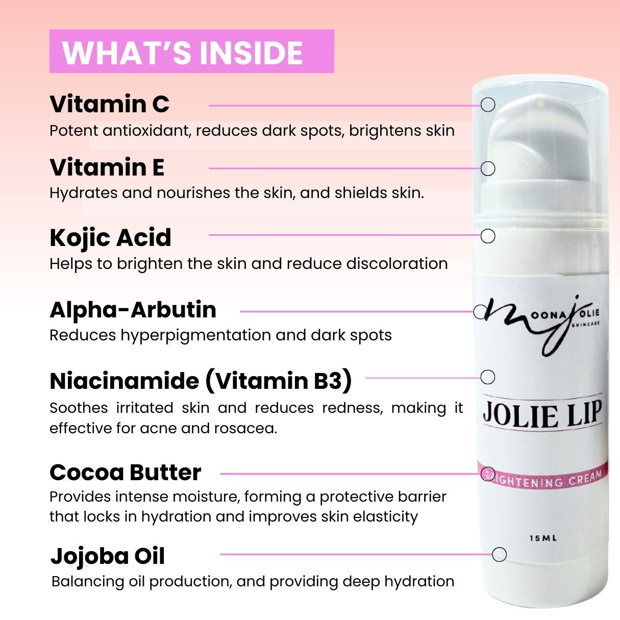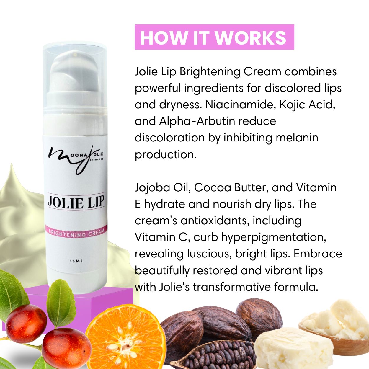 Discover the transformative power of Jolie Lip Brightening Cream, suitable for smokers and individuals with naturally dark lips. Also targets dark under eyes.