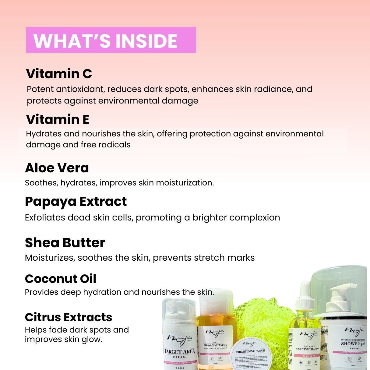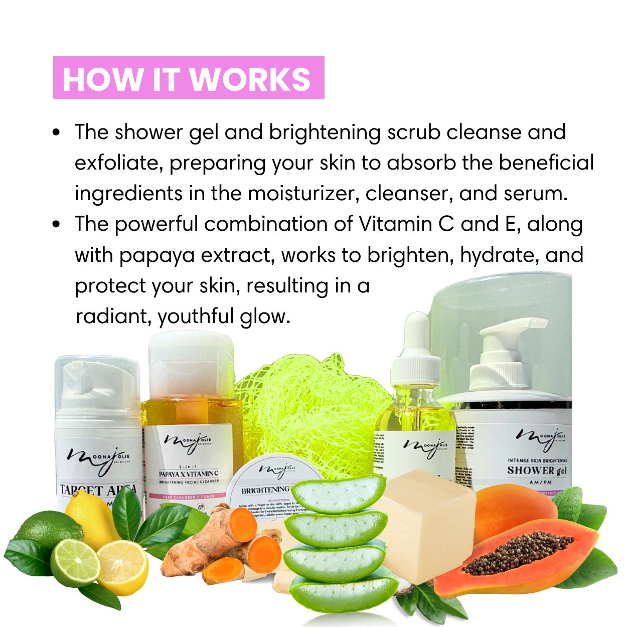The Jolie Ultimate Skin Brightening Kit works through a synergistic approach to skincare. Each product in the kit is designed to complement the others, providing comprehensive care for your skin. The shower gel and brightening scrub cleanse and exfoliate, preparing your skin to absorb the beneficial ingredients in the moisturizer, cleanser, and serum. The powerful combination of Vitamin C and E, along with papaya extract, works to brighten, hydrate, and protect your skin, resulting in a radiant, youthful glow. By following the 5-step routine consistently, you'll notice a significant improvement in your skin's texture, tone, and overall appearance.
