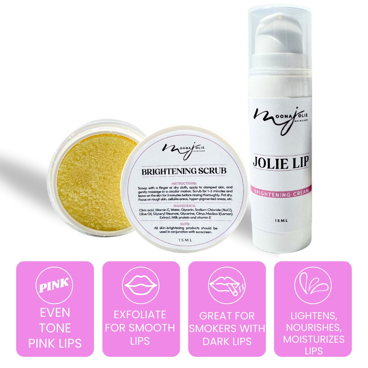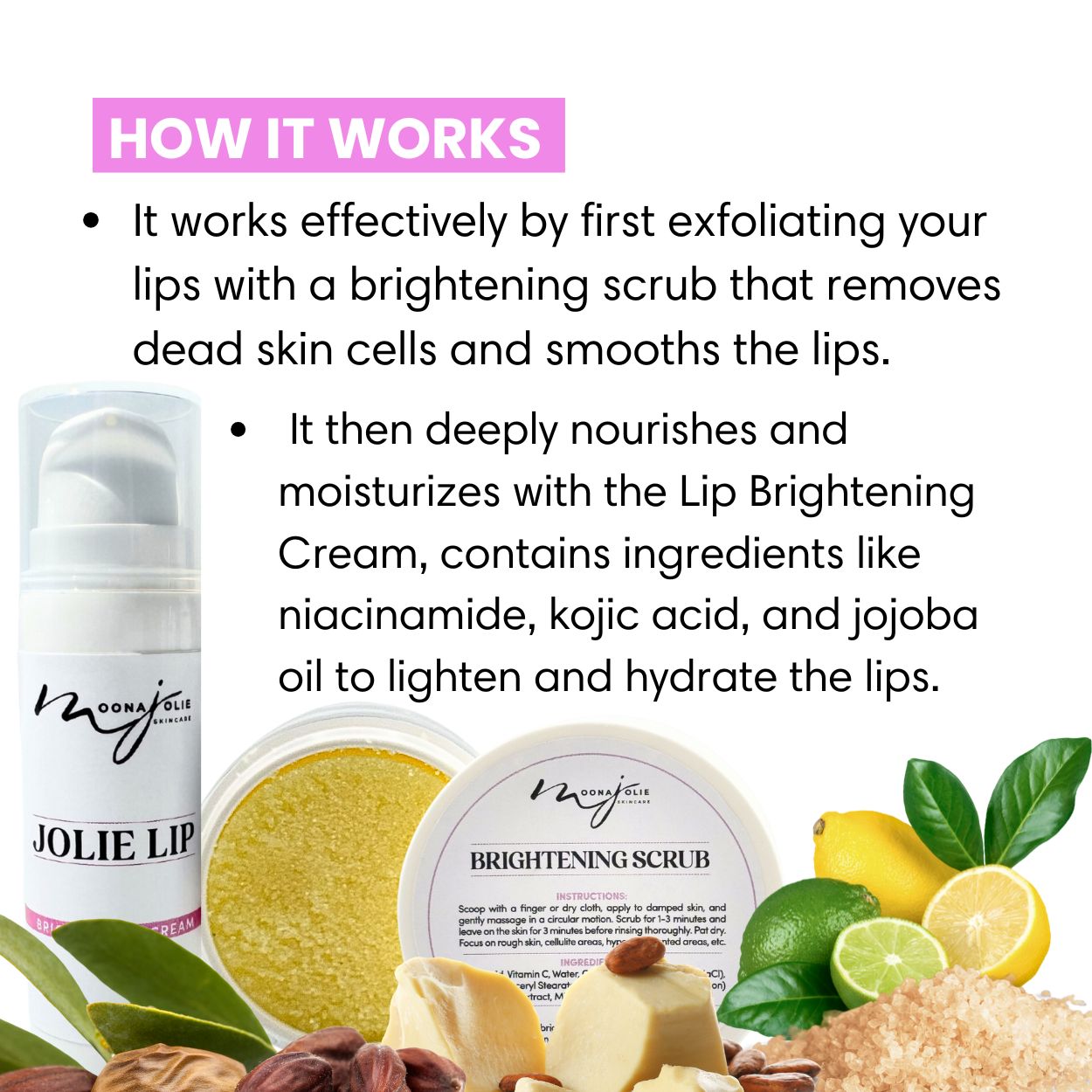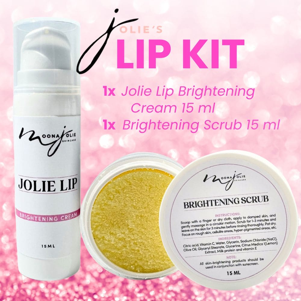 Jolie's Lip Kit is a specialized beauty product designed to enhance the appearance and health of the lips. It consists of a two-step process: an exfoliating brightening scrub followed by a nourishing lip brightening cream. The kit is formulated with active ingredients like Niacinamide, Kojic Acid, Vitamin C, and Jojoba Oil, which work together to moisturize, lighten, and protect the lips.