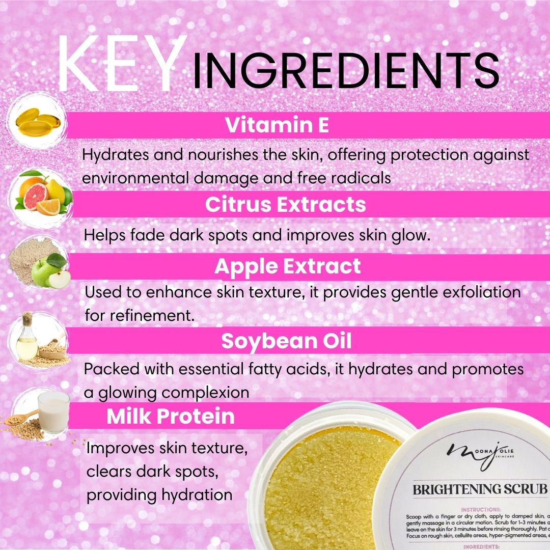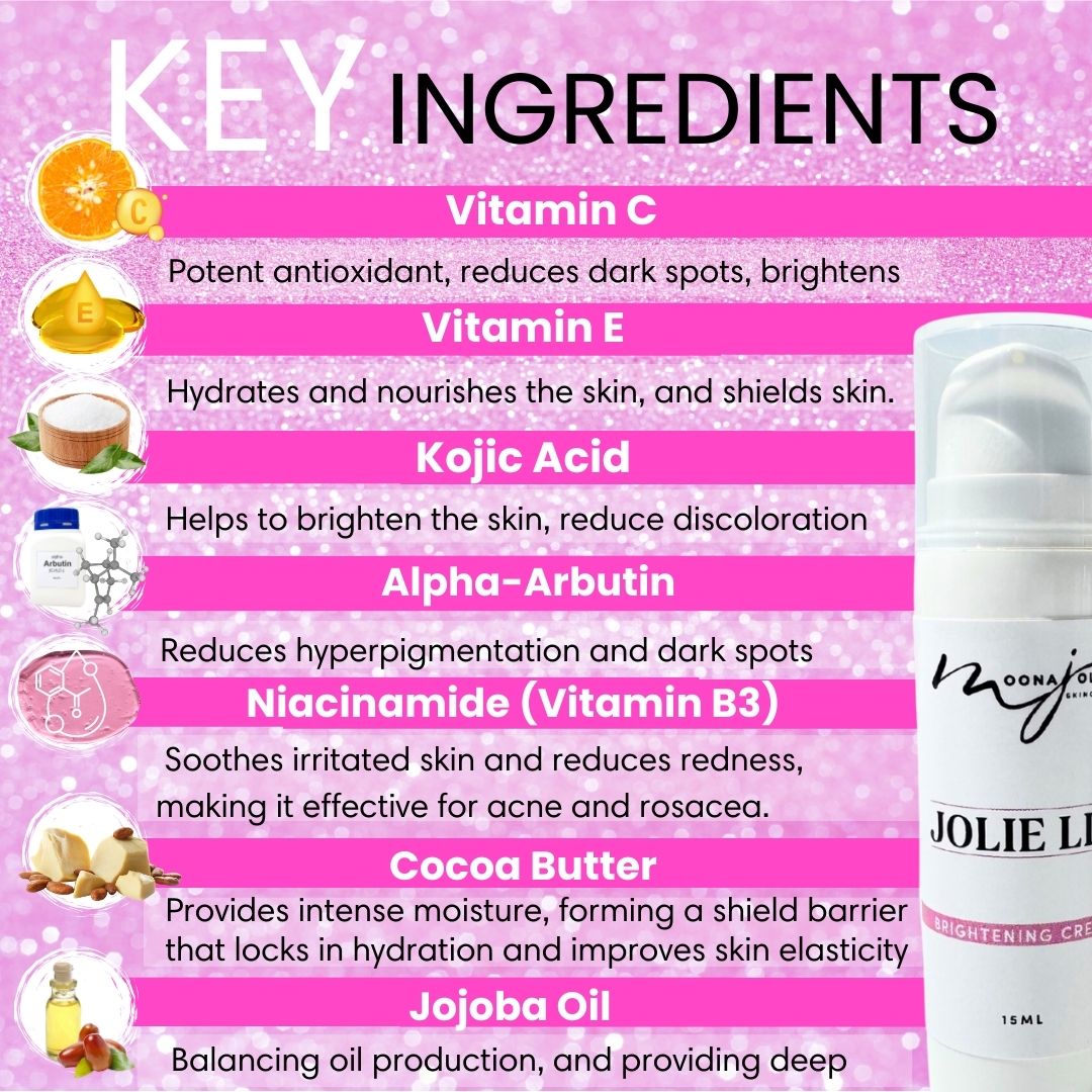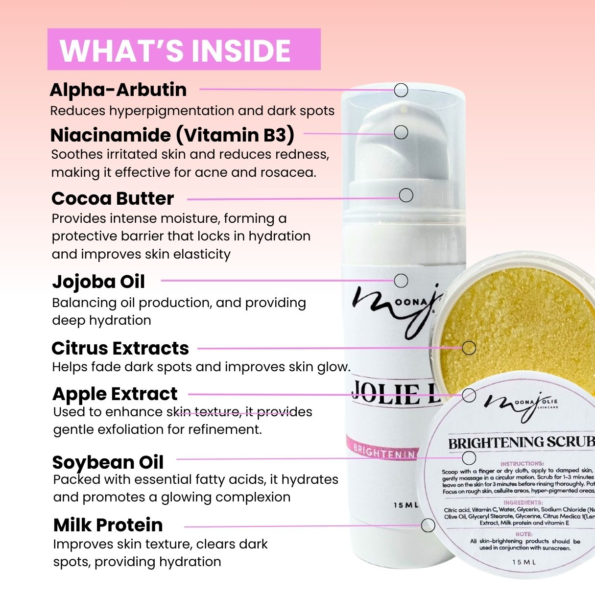 Jolie's Lip Kit is a specialized beauty product designed to enhance the appearance and health of the lips. It consists of a two-step process: an exfoliating brightening scrub followed by a nourishing lip brightening cream. The kit is formulated with active ingredients like Niacinamide, Kojic Acid, Vitamin C, and Jojoba Oil, which work together to moisturize, lighten, and protect the lips.