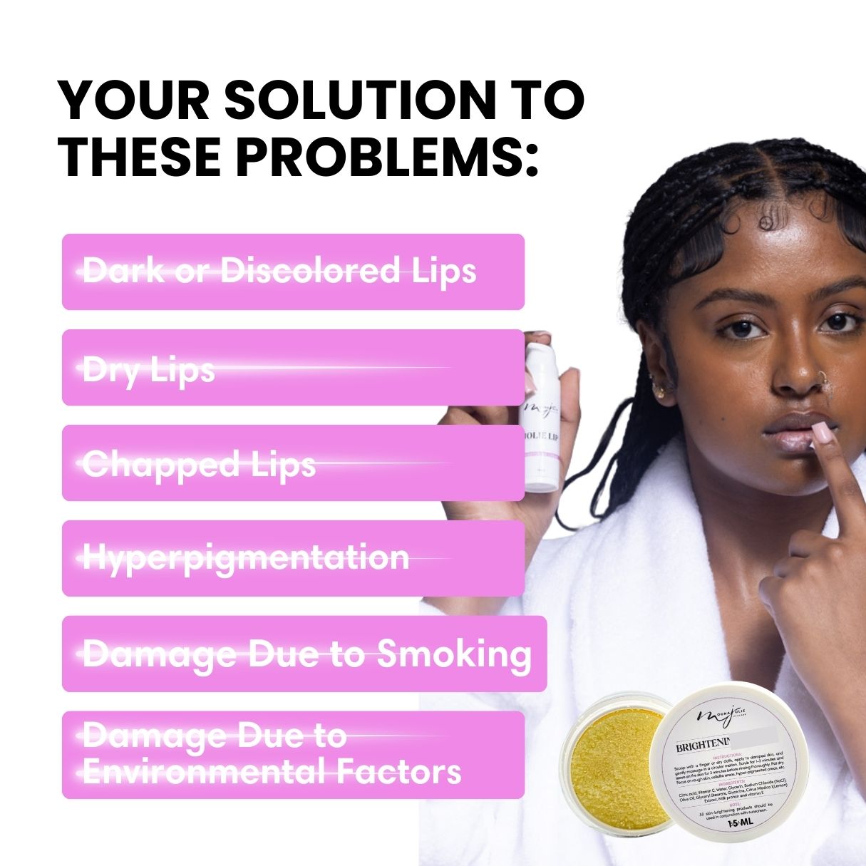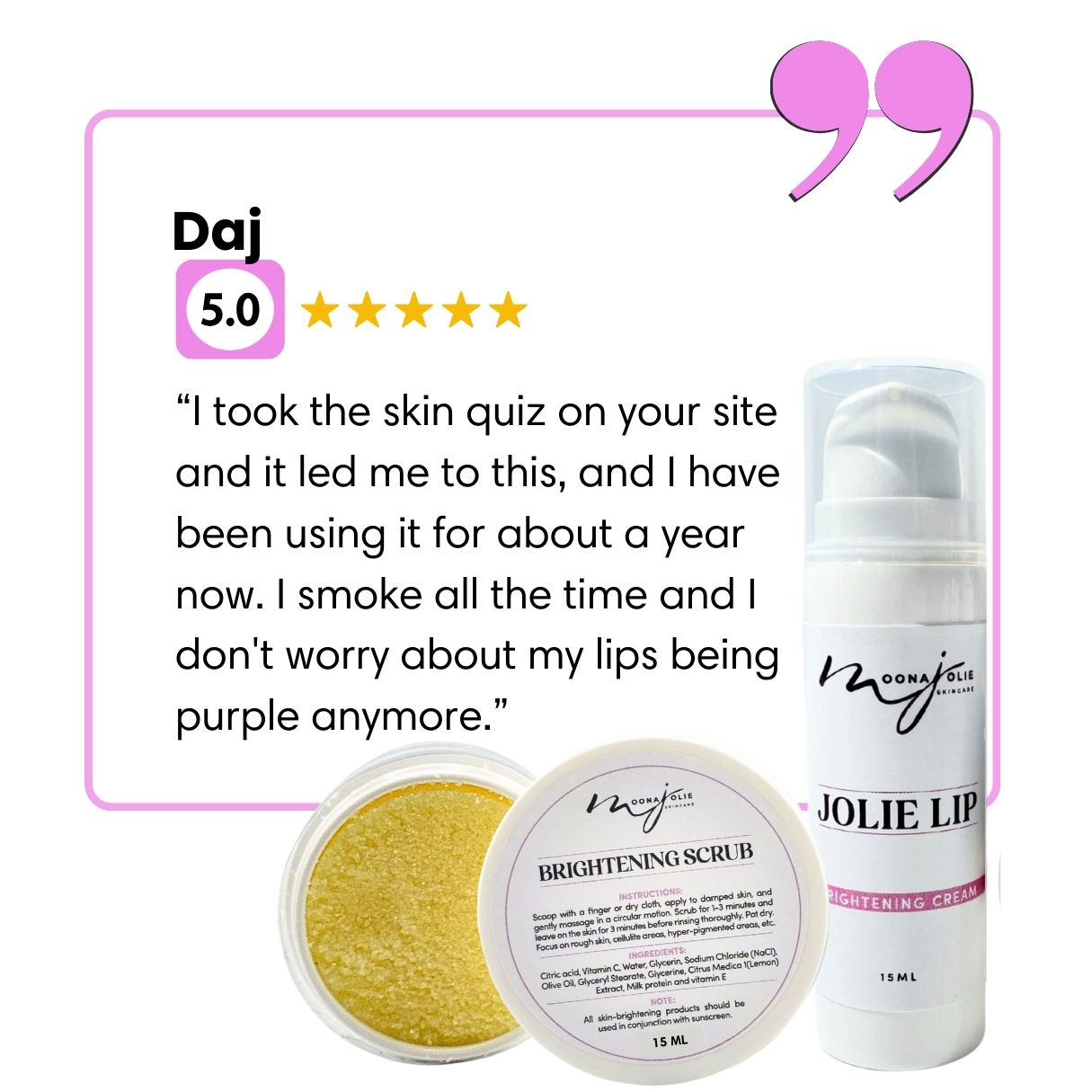 Discover the charm of Jolie's Lip Kit, your ultimate solution for vibrant and hydrated lips. This two-step kit begins with a gentle exfoliating scrub to smooth your lips, followed by a brightening cream enriched with Niacinamide, Kojic Acid, and Vitamin C. Perfect for anyone seeking to enhance their natural lip color and texture, Jolie's Lip Kit ensures your smile is always soft, bright, and beautiful. Embrace the transformation and let your lips shine!