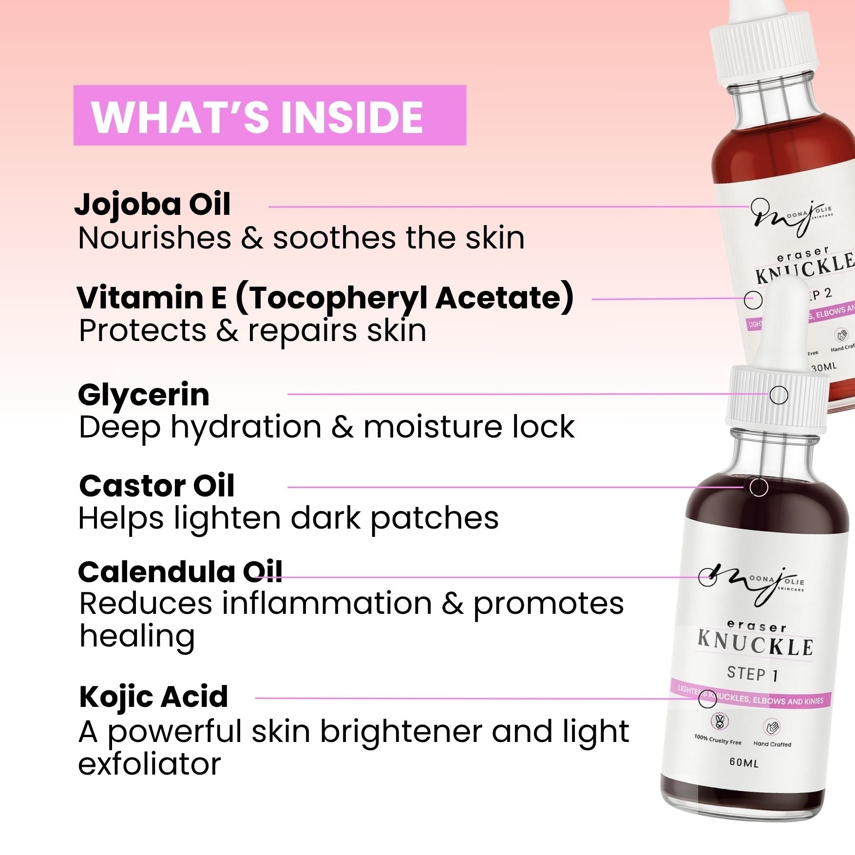 Our formula targets pigmentation with ingredients like Glycerine and Vitamin E, which penetrate the skin to lighten dark areas and provide nourishment and hydration.