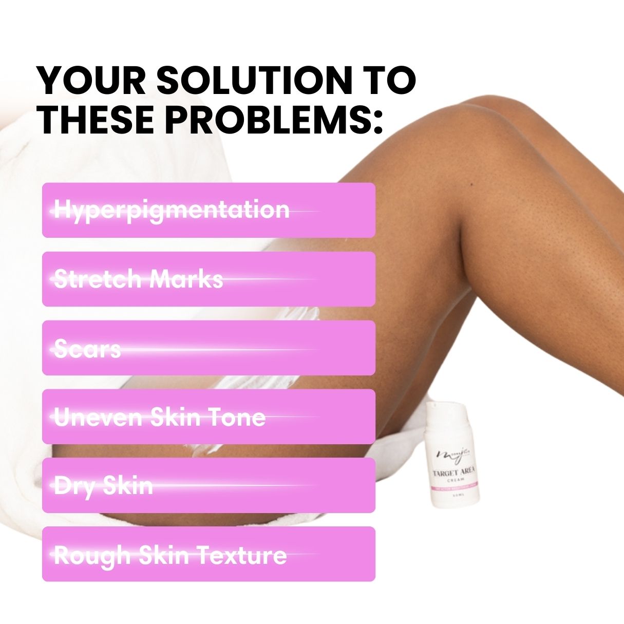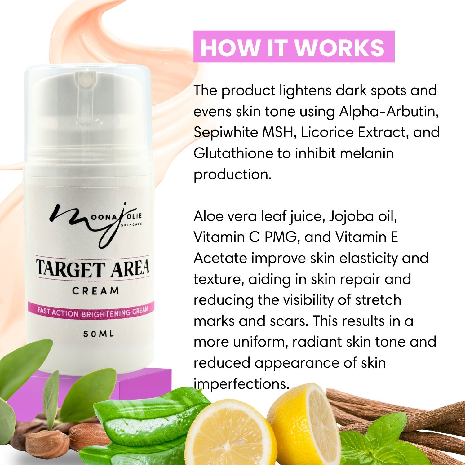 The Fast Action Target Area Cream is suitable for anyone looking to reduce dark spots, stretch marks, scars, and achieve a brighter, more even skin tone.